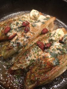 - Bak de witlof eerst even op de gesneden kant totdat deze bruin kleurt.